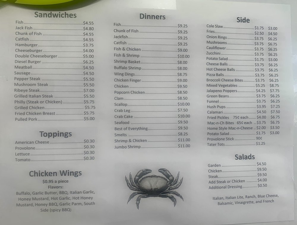 Steve's Fish & Chips, located in Steubenville, OH, offers a diverse menu featuring salads, burgers, and seafood. Known for its thick and moist fish sandwiches, customers rave about the quality and reasonable prices. The historic and timeless look of the restaurant adds to its charm, with outdoor seating available for a relaxed dining experience. With a menu filled with options like grilled chicken salad, cheeseburgers, and grilled Italian steak, there is something for everyone to enjoy. Customers praise the friendly service and unique sauces that accompany the dishes, making it a must-visit spot in the area. Whether you're a local looking for a new favorite spot or a visitor exploring the area, Steve's Fish & Chips is a great choice for a satisfying and flavorful meal.